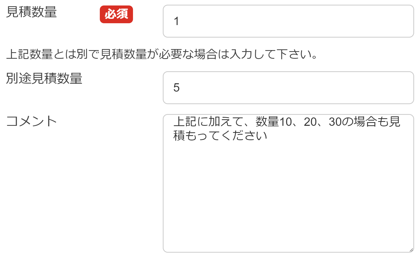 最大5パターンまでの数量の見積もり依頼ができます。[見積数量 必須]、[別途見積数量]に加えて、コメント欄に最大3パターンまでの希望数量をご記入ください。1~10のように、レンジでご依頼いただくことはできません。